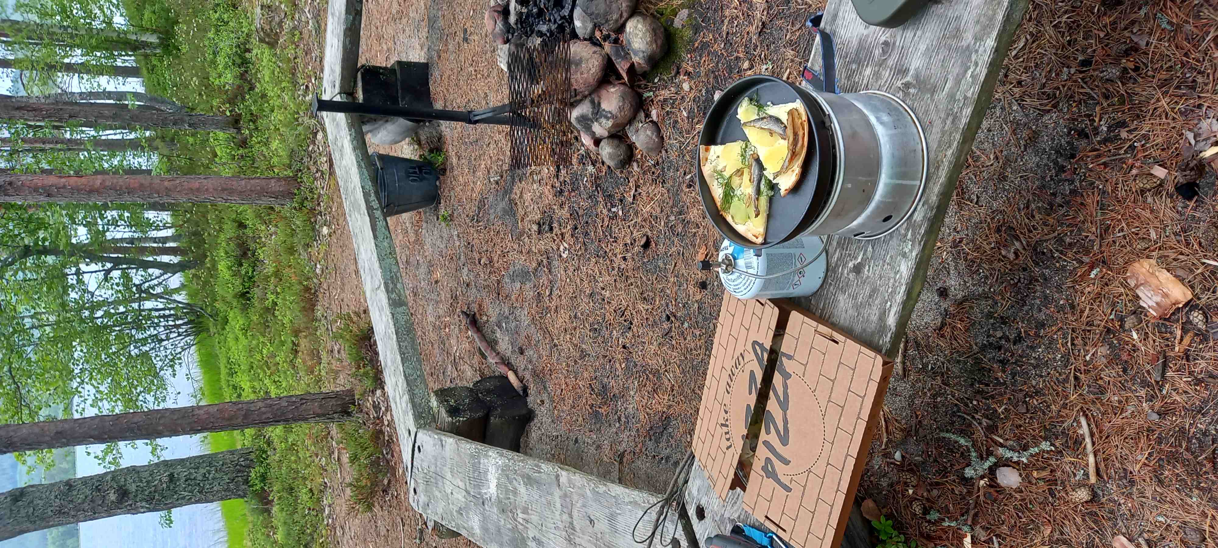Ostin Kolin satamaravintolasta gluteenittoman savumuikku pizzan mukaan ja söin sen Hiekkasaaren leiripaikassa, ensimmäinen kerta souturetkeily urallani. Tuntui ruhtinaalliselta syödä vaihteeksi pizzaa leiri olosuhteissa.