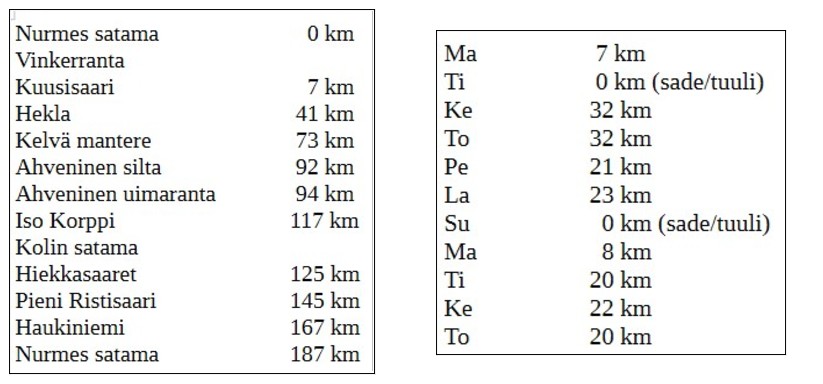 Yhteensä 187 km ja 11 päivää eli keskimäärin 17 km/pv